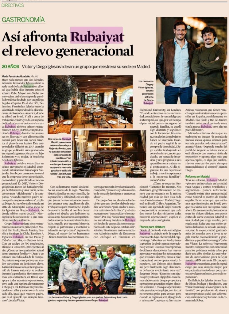 En todos os establecementos do grupo Rubaiyat, que dirixe un dos fillos de Belarmino Fernández Iglesias, o cliente atopa o mesmo estándar de calidade, servizo e arquitectura rústica e elegante.